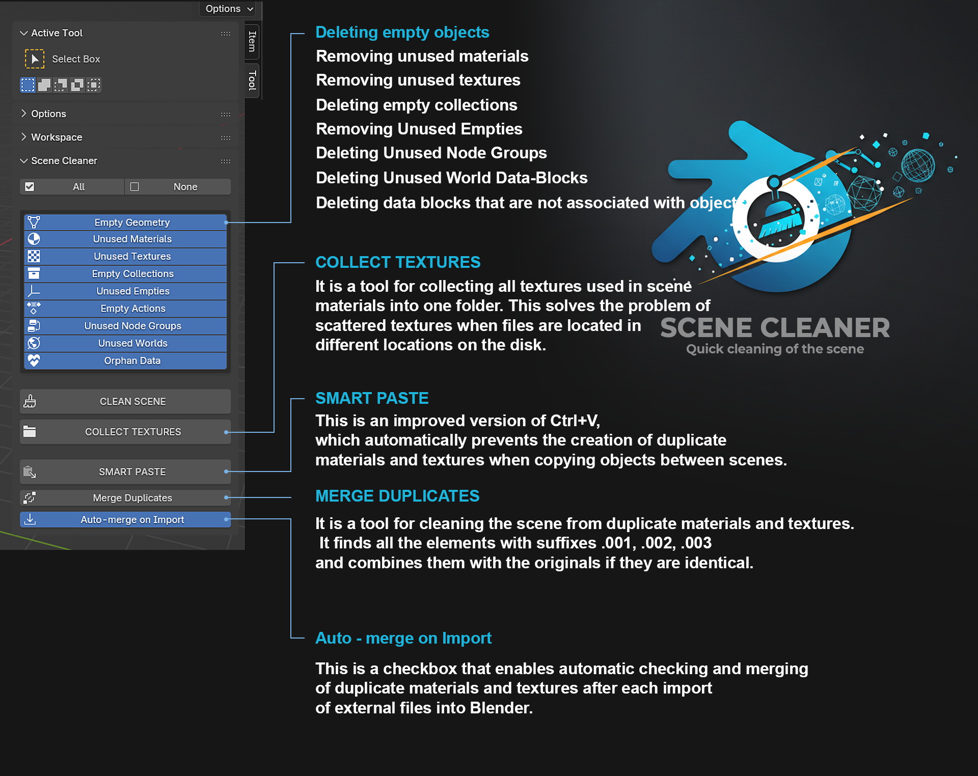 Scene Cleaner — a professional tool for optimizing and cleaning scenes in Blender. The addon automatically finds and removes unused data, duplicates, and empty objects, significantly reducing file size and improving workflow performance.